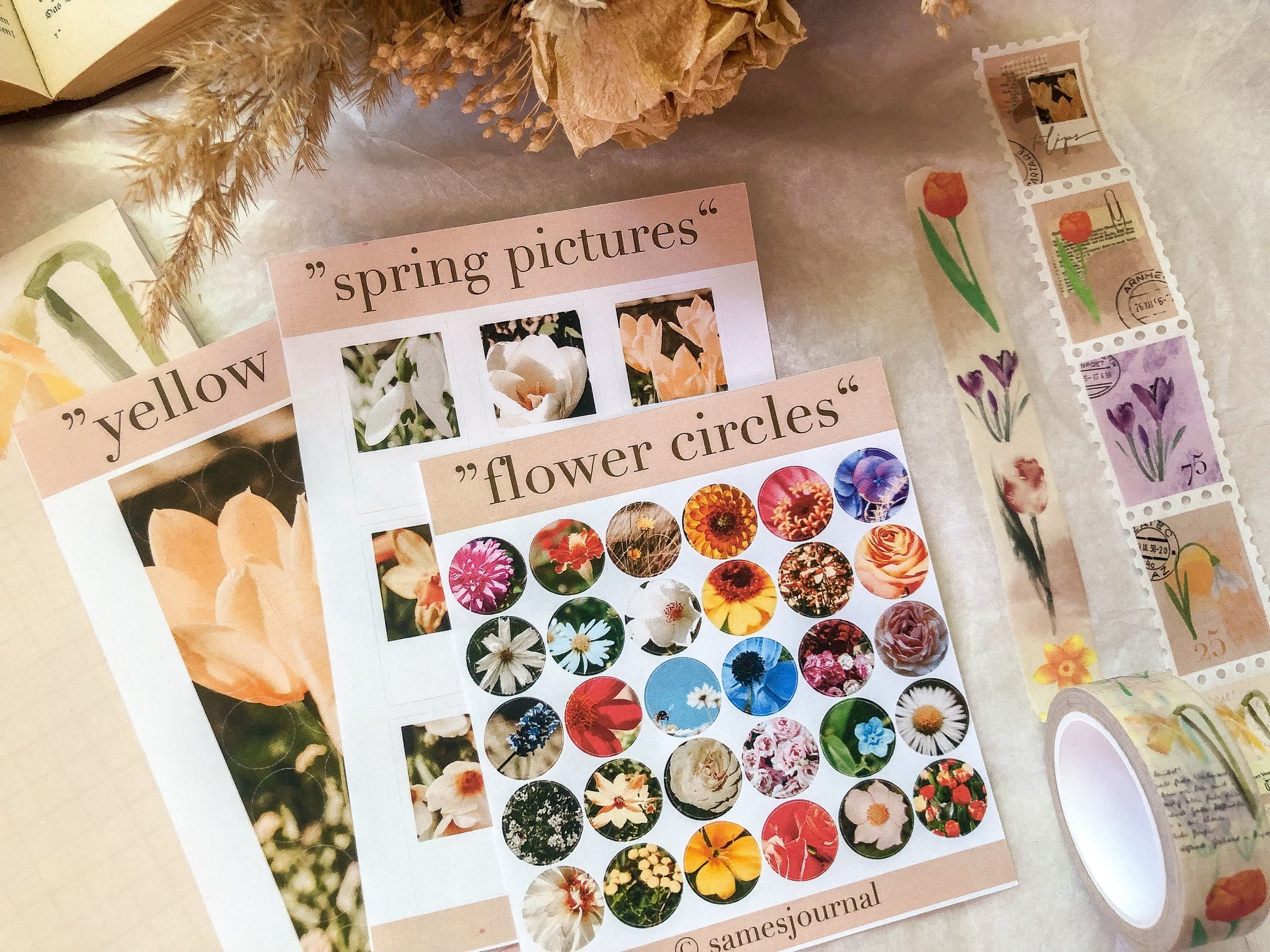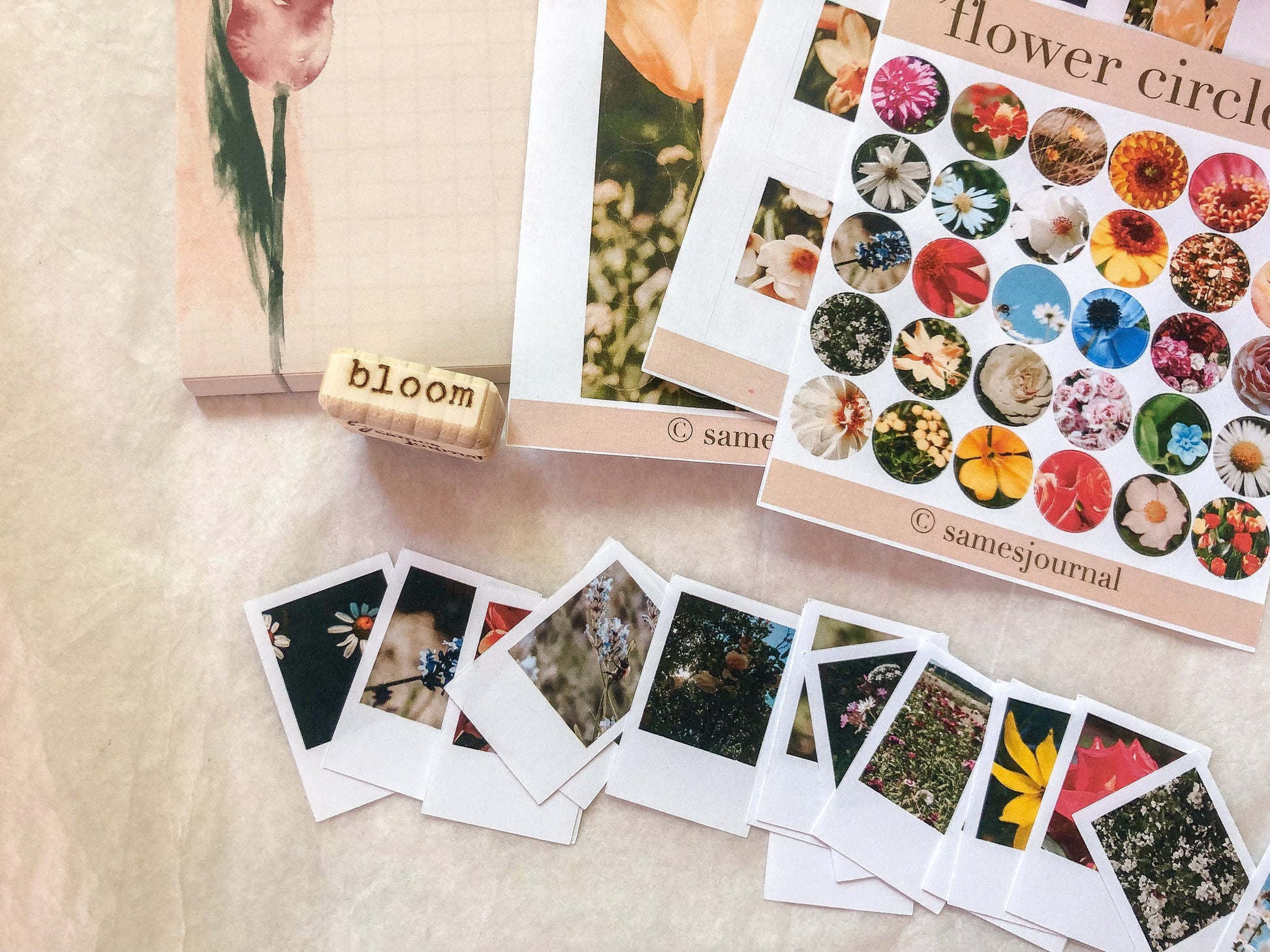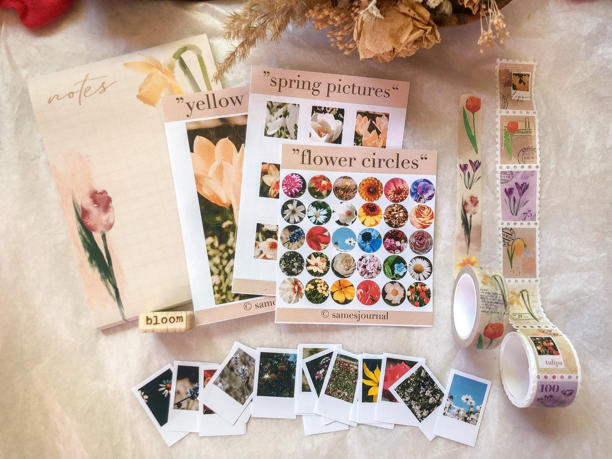The set consists of a notepad, three different sticker sheets, a stamp washi tape, a regular washi tape, a stamp and 18 flower photo stickers.