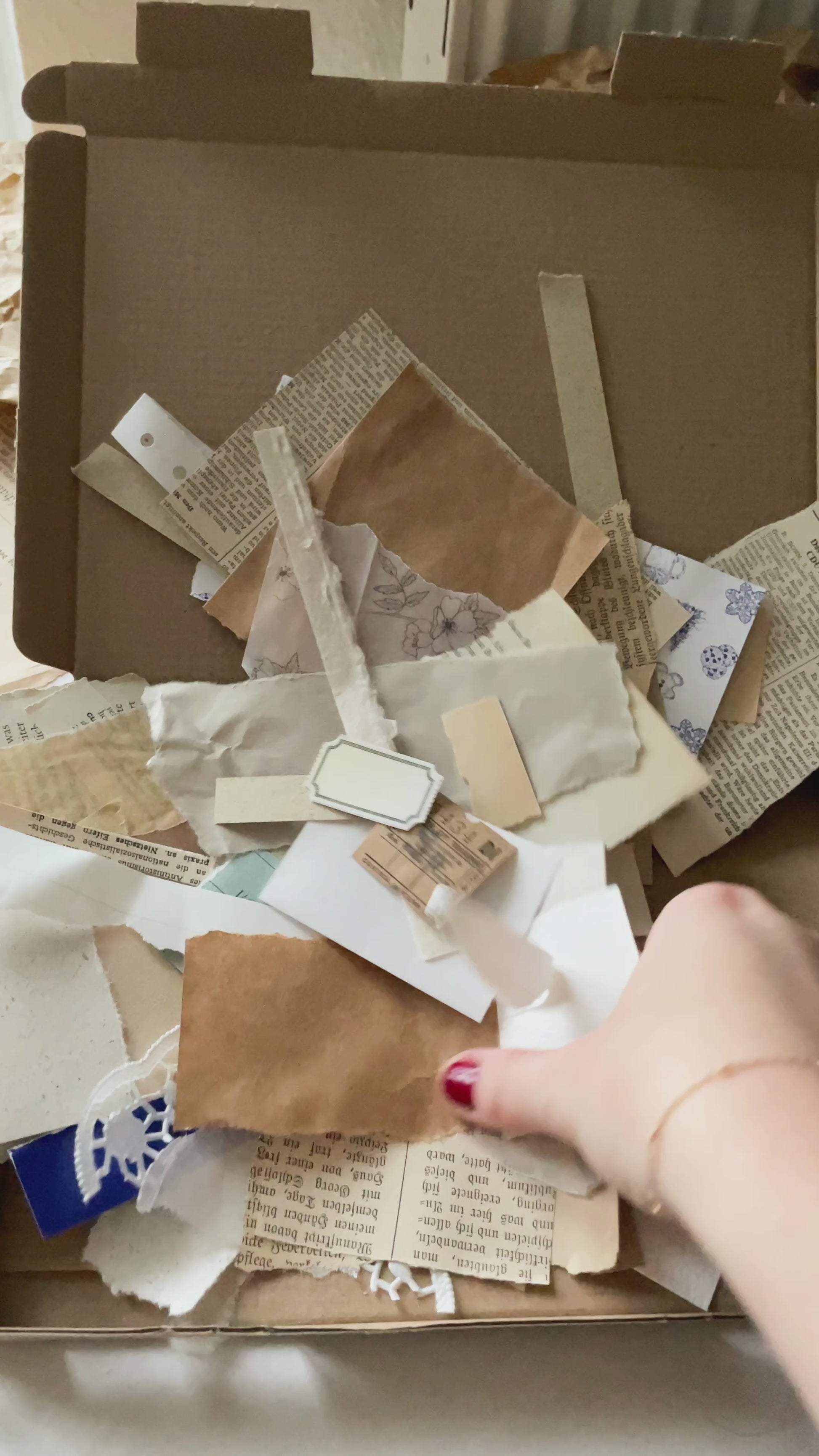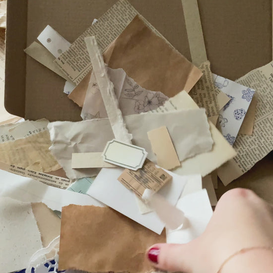 The pieces are of varying sizes. They may include patterned paper, old book pages, colored paper, tracing and kraft paper, lined and graph paper, etc. These papers are perfect for use in your journal, scrapbook, or even pen pal letters.