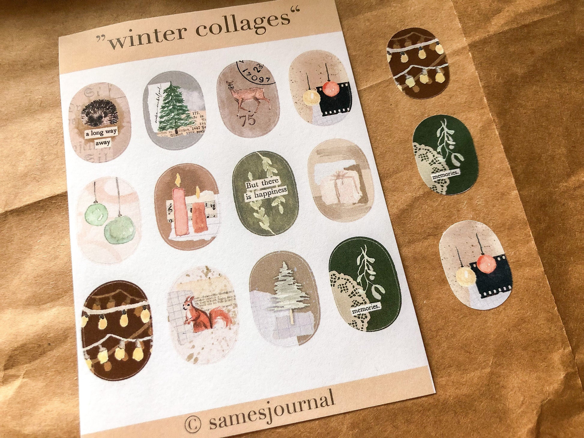 A beautiful sticker sheet with Christmas-themed, rounded collages made with my overlap tape.