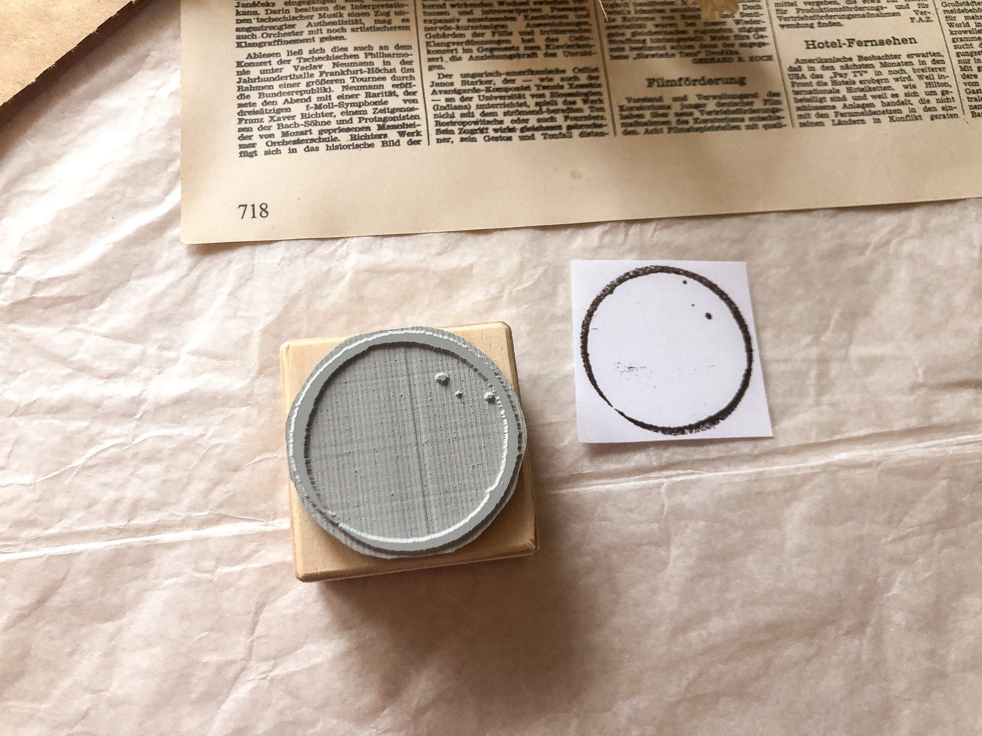 Le tampon mesure 4x4 cm et est collé sur un bloc de bois, vous pouvez donc utiliser le tampon directement.