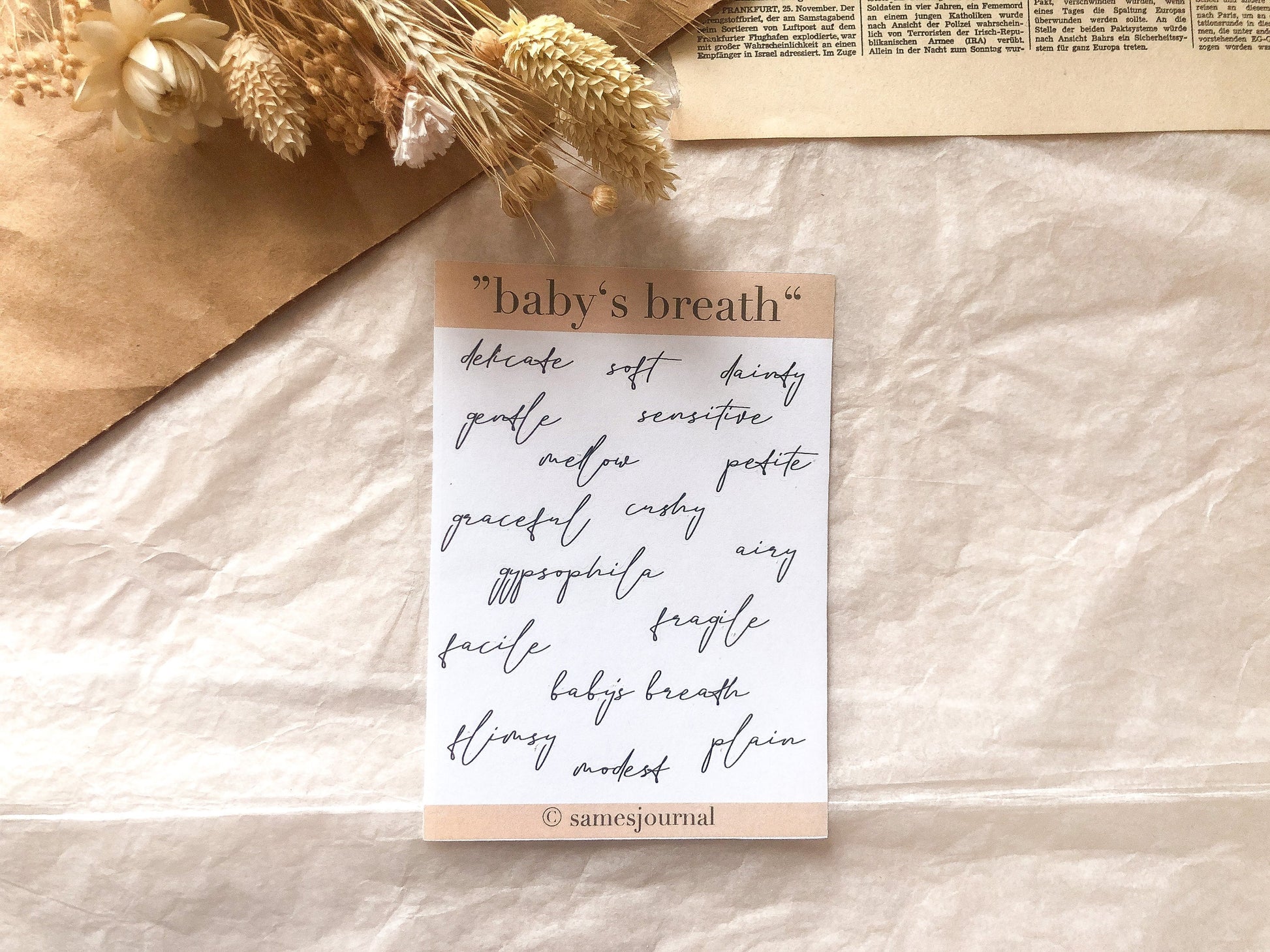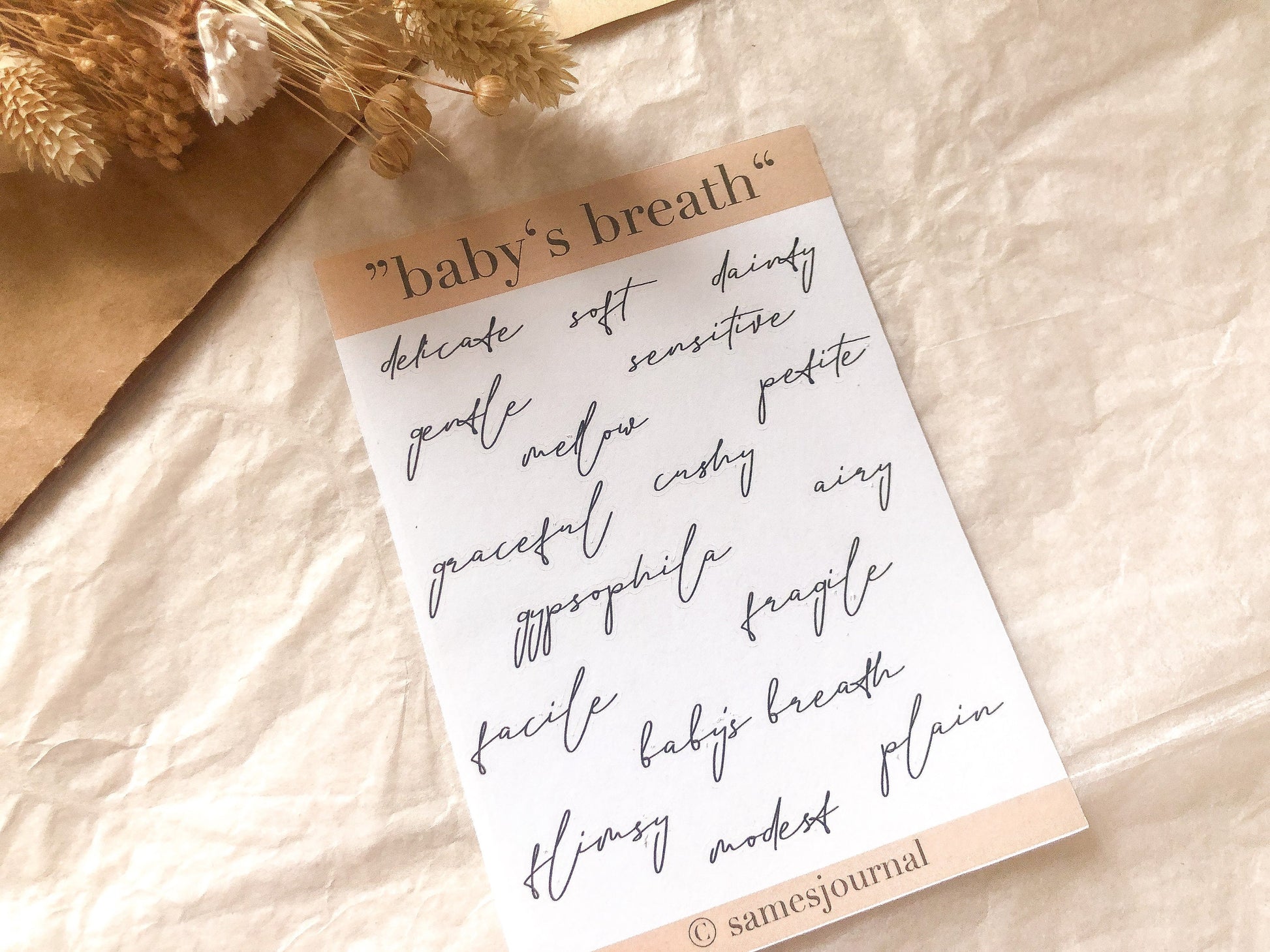 Une belle feuille d'autocollants avec beaucoup de mots sur la gypsophile.