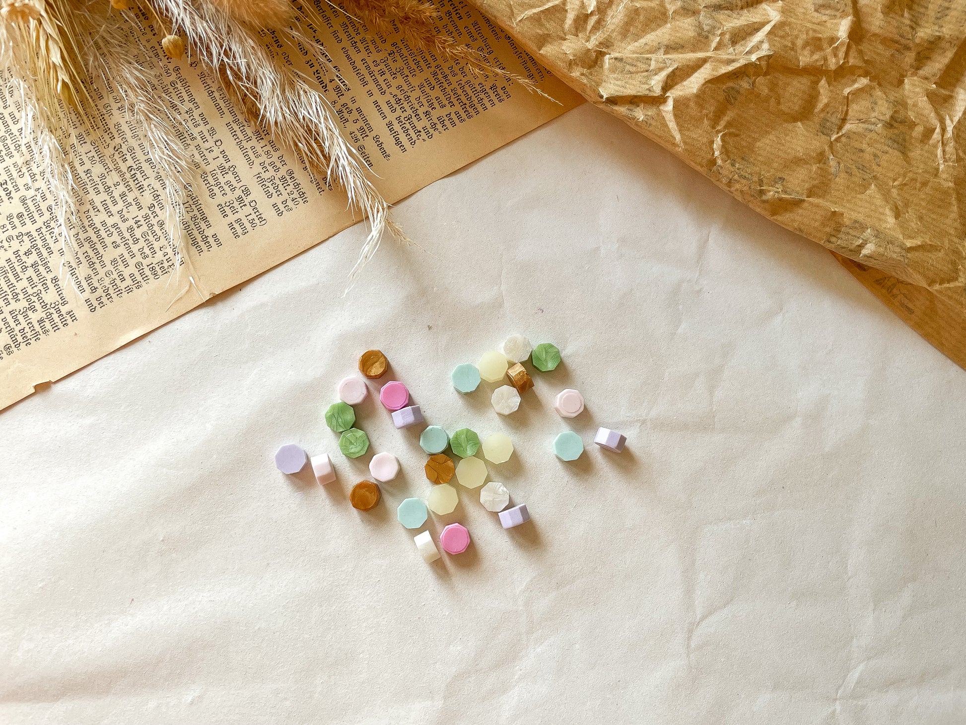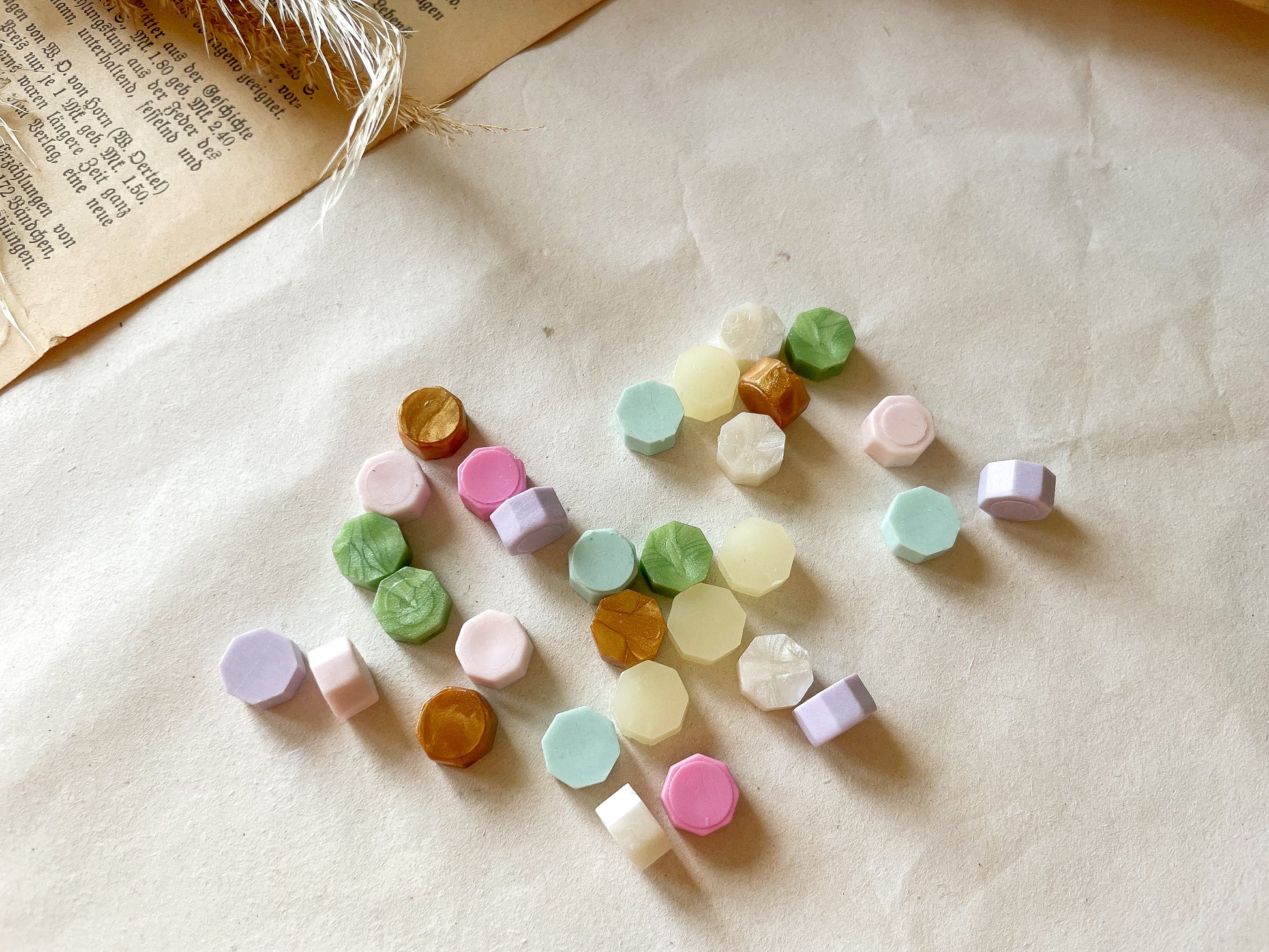 Un ensemble contient 30 perles de cire à cacheter, elles mesurent environ 1x1 cm.