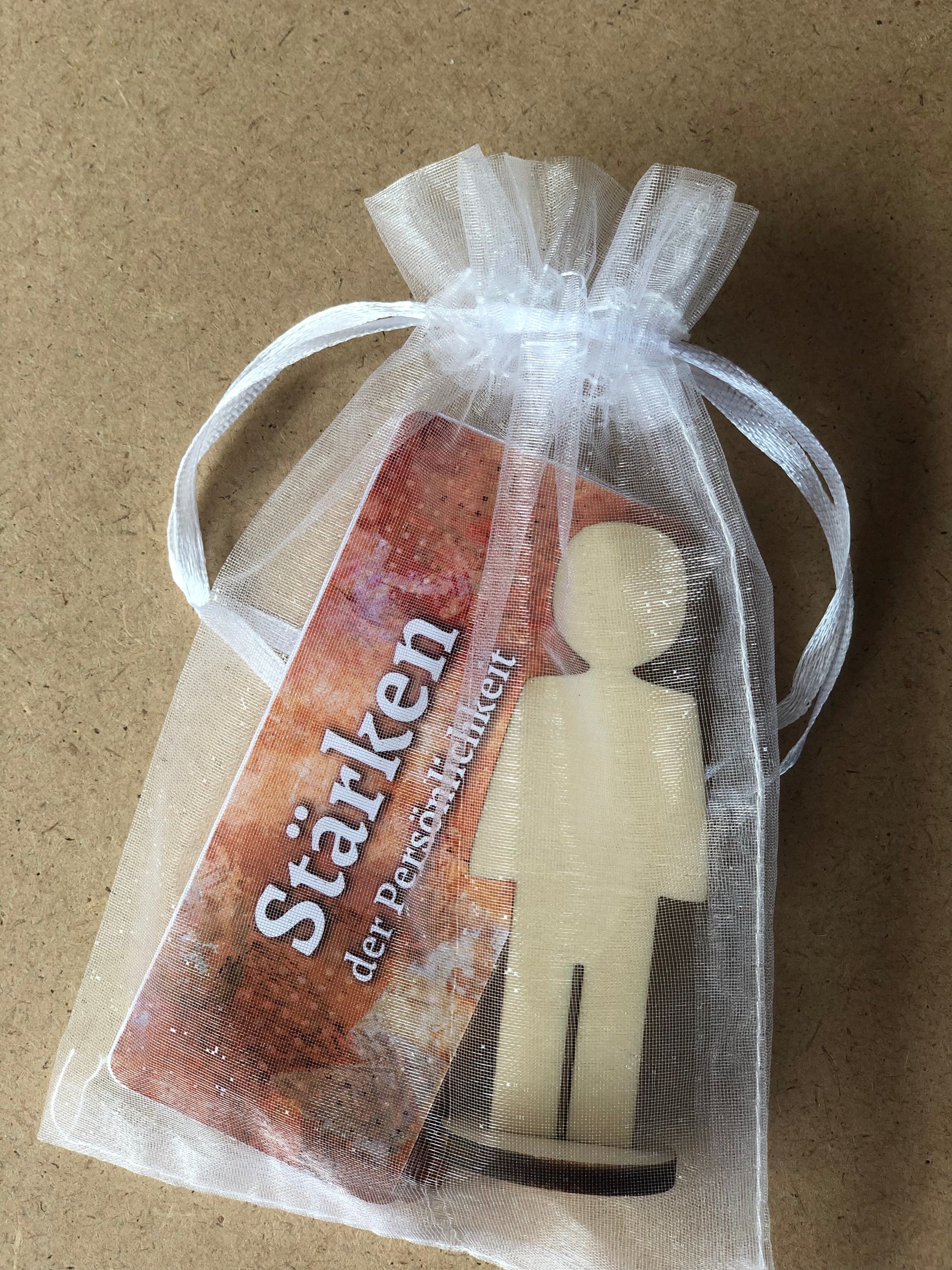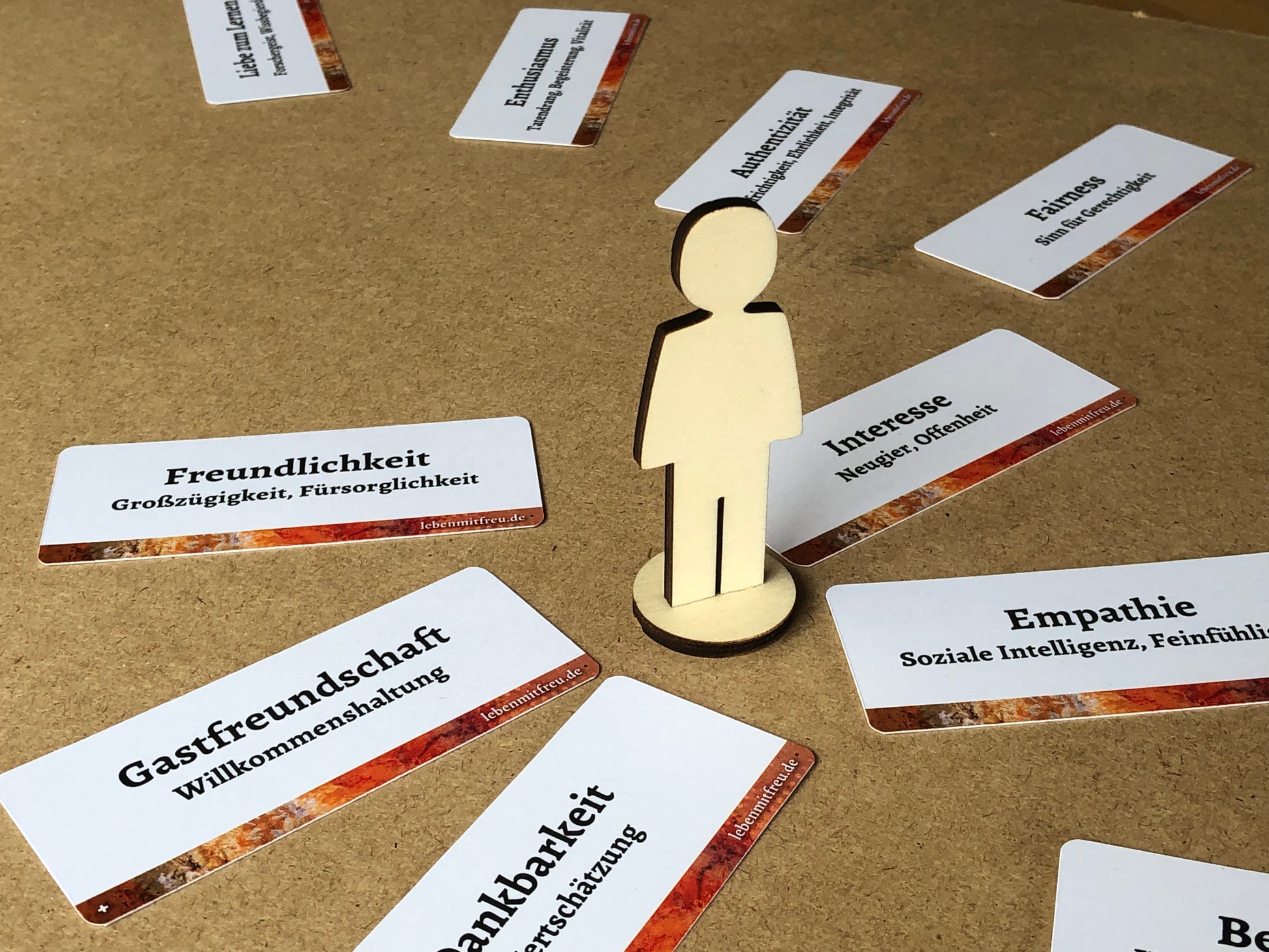 Eine Holzfigur und 30 Karten mit Begriffen von Charakterstärken; auf der Rückseite jeweils eine kurze Beschreibung.
