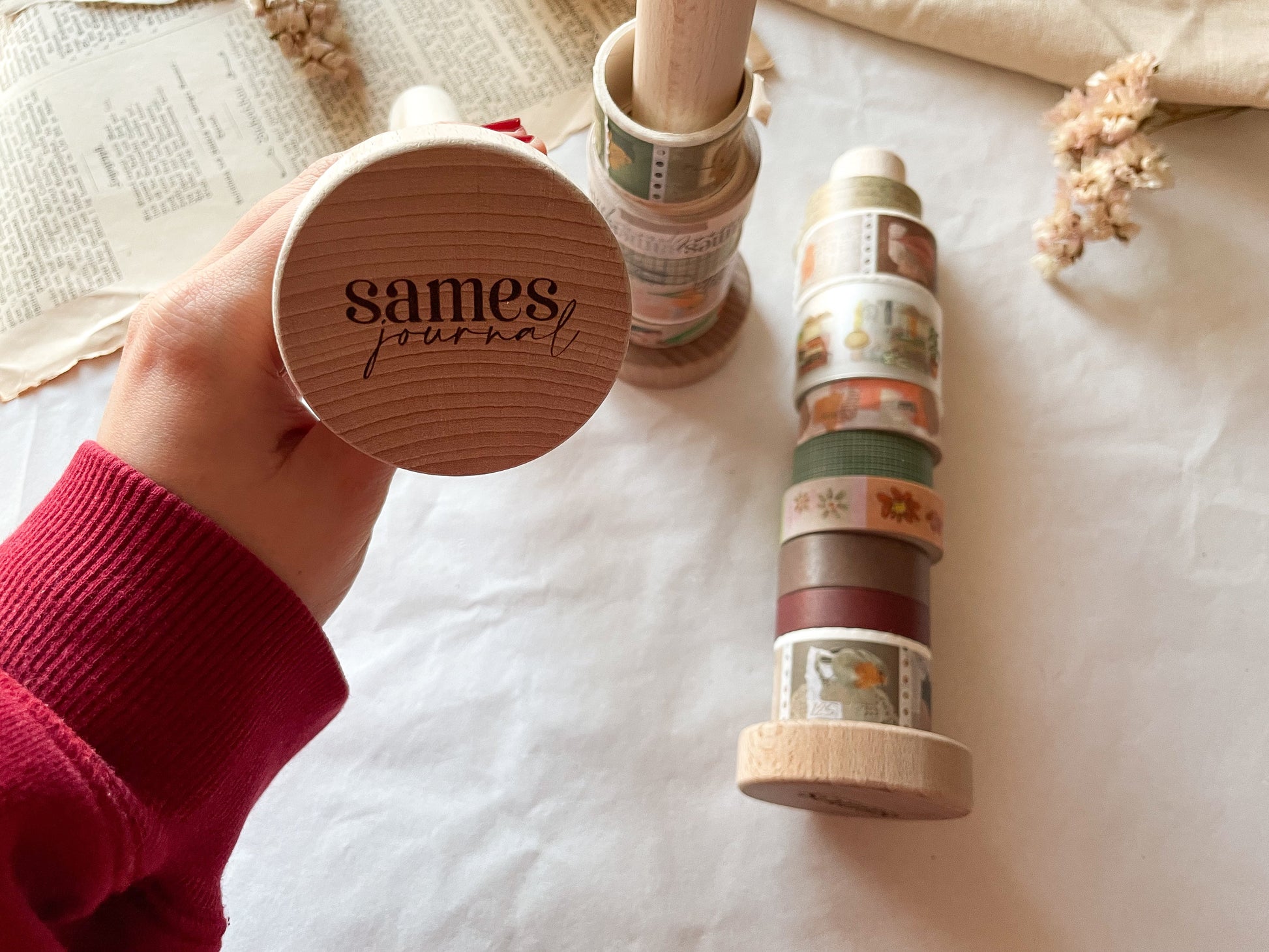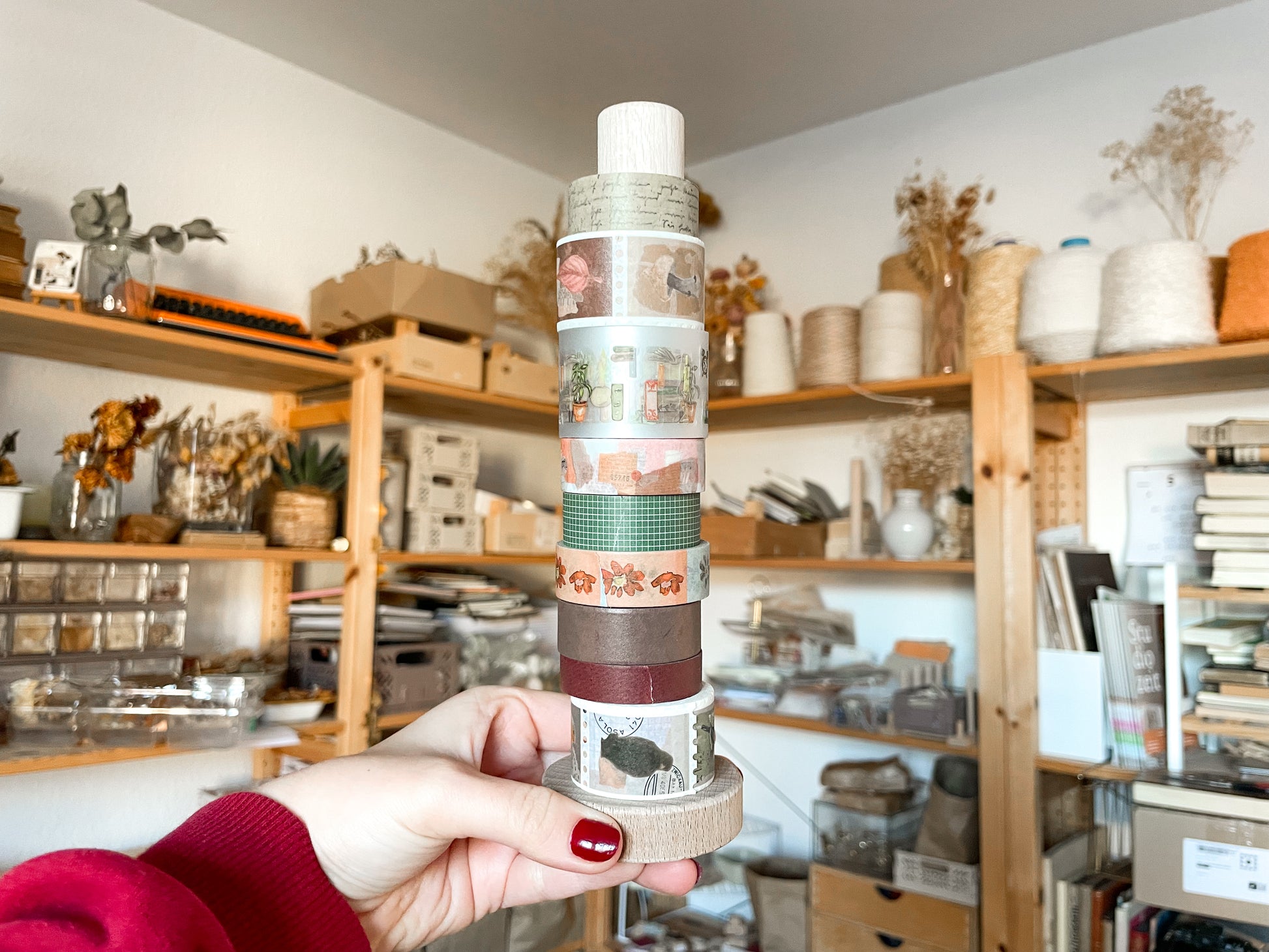 Der handgefertigte Holz-Halter bietet Platz für bis zu 12 Tapes und sorgt für Ordnung auf deinem Schreibtisch, damit du deine Washi Tapes immer griffbereit hältst, aber sie nicht viel Platz wegnehmen.